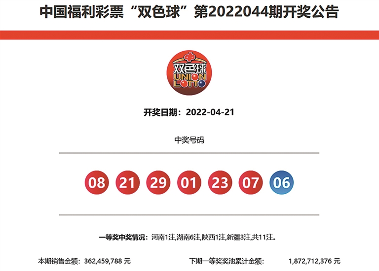4月21日,中国福利彩票双色球游戏第2022044期开奖。本期双色球红球号码为01、07、08、21、23、29,蓝球号码06。