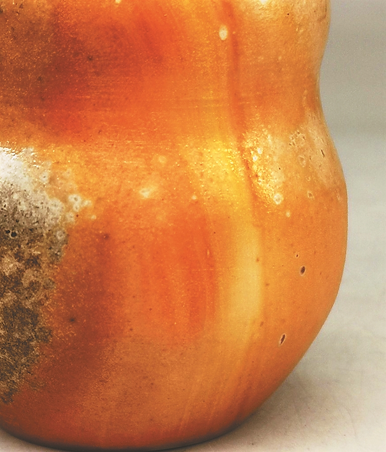 德化白瓷、建阳黑瓷、龙泉青瓷……上京金瓷,区别于传统瓷器青、白、黑、红、花色系,金色系实属罕见。这金色质地不是上釉得来的,而是一方土木的绝美配合。本地高岭土的铁含量较高,用王仁亮的话说,“烧白瓷白度不够,烧金瓷颜色正好”。瓷器烧成后表面的釉质层来自于自然窑变,是松木燃烧后的木灰与泥坯中的矿物质成分,在窑内1320℃高温中融合变化而成,色彩变化自然丰富。柴窑“入窑一色,出窑万彩”,每件器物自然天成、独一无二,上京金瓷的颜色在黄与橘红色之间变化,精品接近于金色,散发着妙手天成的雅趣。