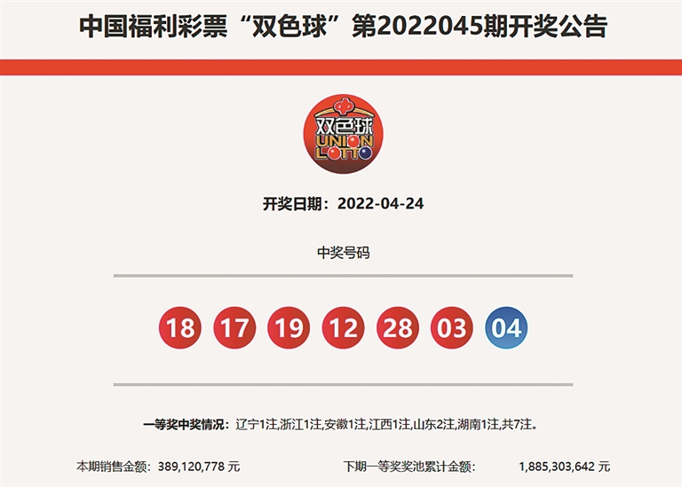 4月24日晚,中国福利彩票双色球游戏进行第2022045期开奖。本期双色球红球号码为03、12、17、18、19、28,蓝球号码为04。