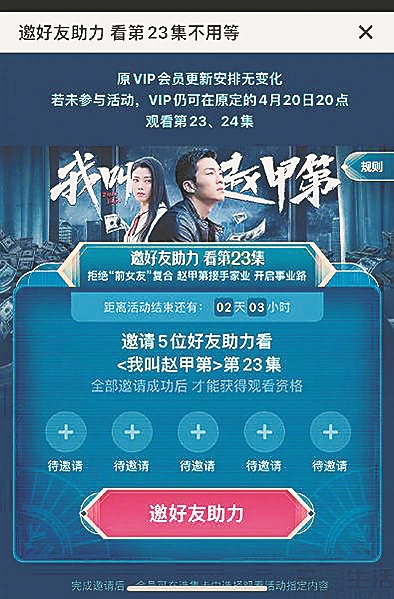 近日,电视剧《我叫赵甲第》的播放方式引发争议:追剧网友发现,即便已经是VIP会员,要想继续抢先看,还需要再邀请5位好友助力,才能解锁最新两集,并且每位受邀者在活动期间只能助力一次。记者了解到,这让不少网友吐槽:“追剧,也要拼人脉?”“是在试探用户底线吗?”