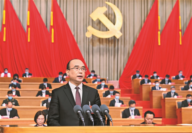许勤代表中国共产党黑龙江省第十二届委员会向大会作报告。 龙头新闻记者 郭俊峰 邵国良 摄