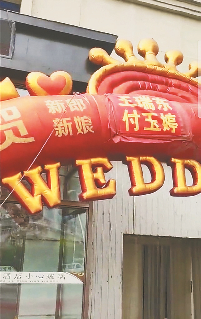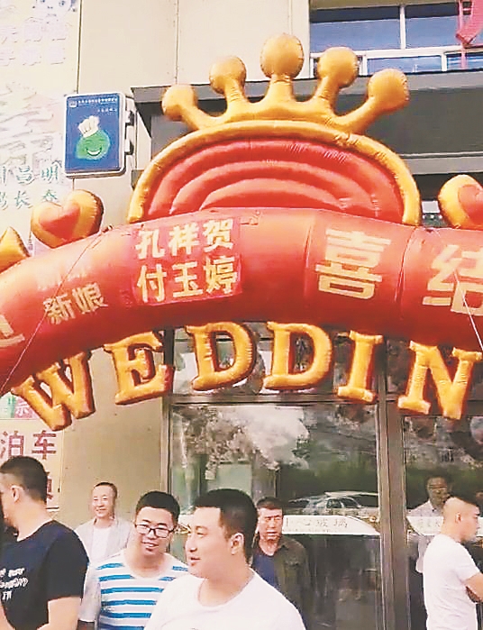 在大庆市龙凤区的一家酒店门口,两个同款婚庆拱门并排而立,上面各自贴着横幅,新郎一个姓孔一个姓王,新娘都叫付玉婷……