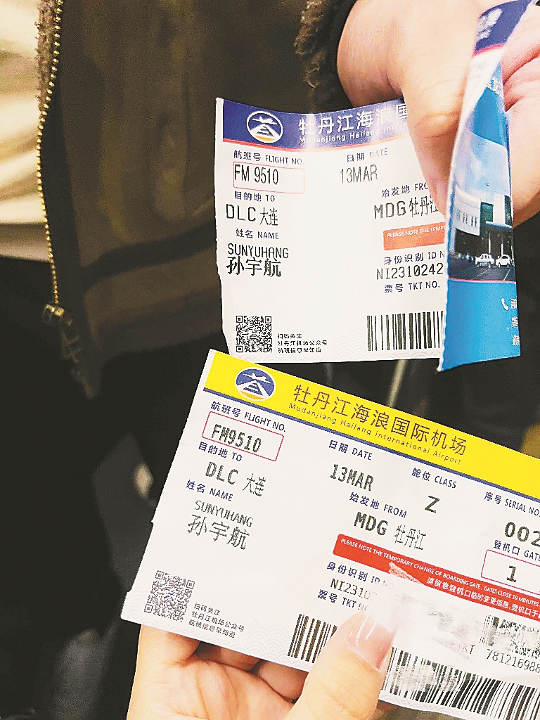 在5月4日发布的一段视频里,两个孙宇航给出了答案。今年3月中旬,要去南宁的男孙宇航接连买了好几张飞机票,结果航班都因故取消,只有3月13日傍晚从牡丹江飞大连中转的那趟航班没被退票,他便坐上了这趟飞机。