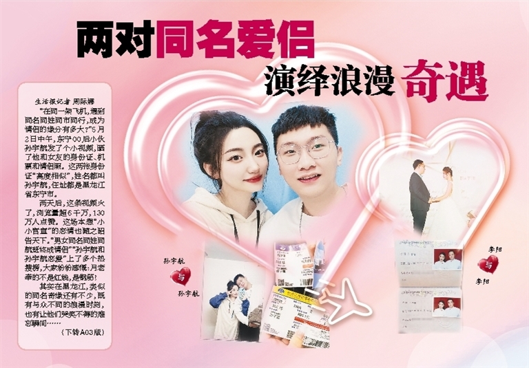 其实在黑龙江,类似的同名奇缘还有不少,既有与众不同的浪漫时刻,也有让他们哭笑不得的难忘瞬间……