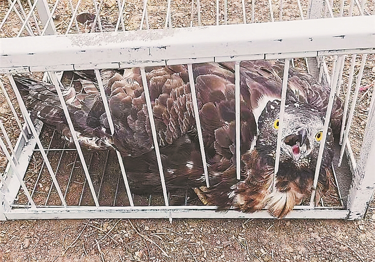 生活报讯 (记者郭登攀 时继凯文/摄) 近日,一只困守在树上的大鹰由于长时间无法正常活动引起了森林警方的注意。民警及时对这只大鹰进行了救助。经专家鉴定,这是一只生病的国家一级濒危野生保护动物“金雕”。