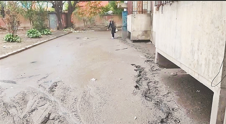 然而,记者进入科研街22号附近的一幢居民楼后院时,却看到:单元门前的小路上遍地是淤泥,并且散发着难闻的气味;在墙根的垃圾处还跑过几只老鼠。一位居民穿着靴子从这条路走过,走到最里面的一个单元时,淤泥已经没过脚踝。