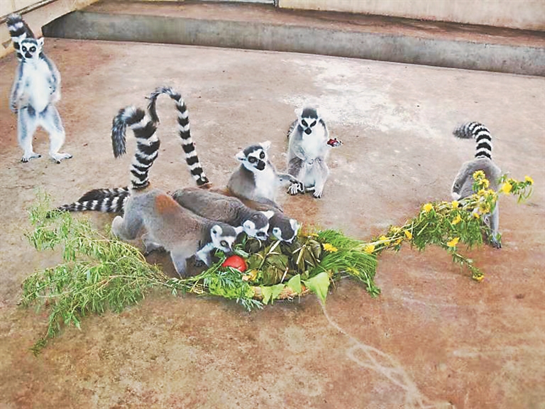 环尾狐猴家族对摆满粽子的“龙舟”十分喜爱,兴奋地守着漂亮的餐桌捧着粽子大快朵颐。狐猴们吃得兴起,连“龙舟”上装饰用的小野花都不放过,争先恐后吃得干干净净。