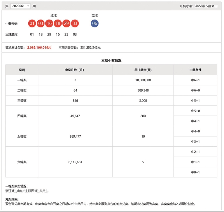 5月31日晚,中国福利彩票双色球游戏进行第2022061期开奖。当期双色球红球号码为01、03、16、18、29、33,蓝球号码为06。