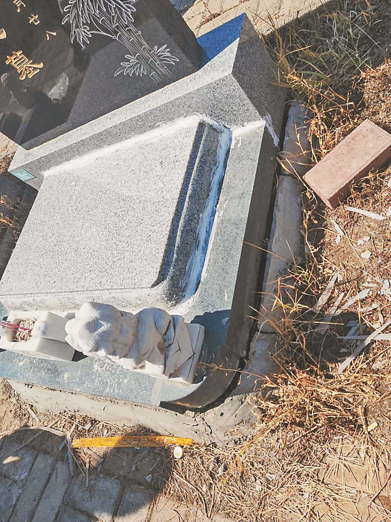 5月31日,记者在大庆市净园公墓内看到,周女士母亲的墓位在舒云园24排,墓碑下面的基座有维修过的痕迹,下面的水泥底座也被重新抹过。而且旁边的好几座墓碑底座都有裂痕,水泥底座与地面形成了裂缝,部分底座的水泥块已经断裂。
