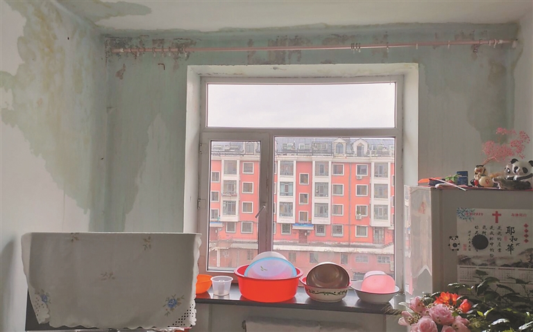 此后,记者又来到王阿姨隔壁的张女士家中,屋里也摆满了盆和桶,天棚被水泡了,墙皮大面积脱落,尤其是床上方的墙皮脱落得非常严重,不时往下掉。张女士说:“晚上睡觉不是水滴在床上,就是墙皮砸在脸上,根本没法在床上睡觉,我去年刚刷的墙,今年就给泡成这样了。”