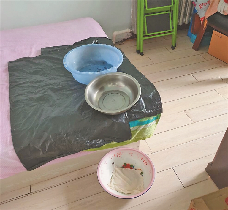 6日,生活报记者在王阿姨家中看到,地上、窗台上、床上、桌子上,到处都摆着盆和水桶,用来接从棚顶滴落的水。当时外面下着小雨,天棚上不停往下滴水。在墙角处,王阿姨还垫上了衣服、拖布,防止水滴到地上;床上垫着一层塑料布,上面还摆着两个盆接水,床边地上还有一个盆。王阿姨告诉记者:“这几天我只能睡在沙发上,还得半夜起来倒盆里的水,根本睡不好。”