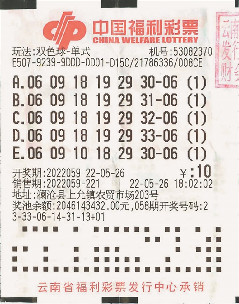 5月26日晚,中国福利彩票双色球游戏进行第2022059期开奖,云南一彩民鸿运当头,喜中572万头奖。这注头奖出自普洱市澜沧县上允镇农贸市场203号53082370号销售网点,中奖彩票是一张投注金额10元的单式票,中奖金额572万多元。