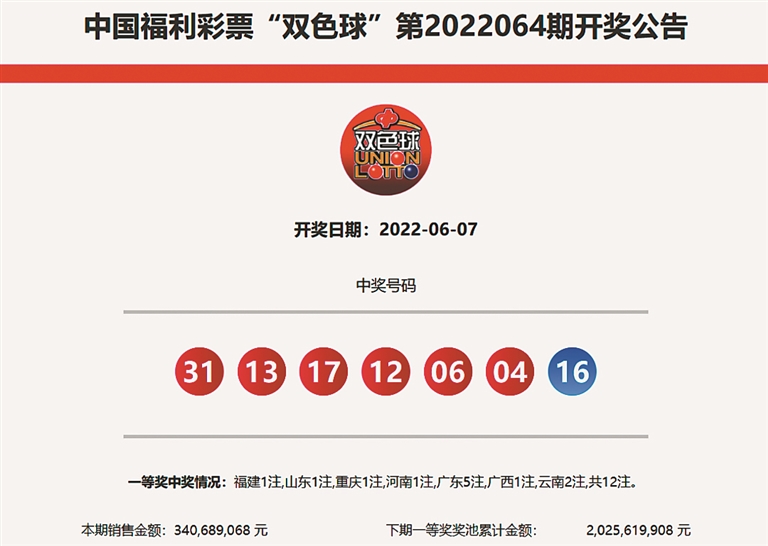 6月7日晚,中国福利彩票双色球游戏第2022064期开奖。本期双色球红球号码为04、06、12、13、17、31,蓝球号码为16。