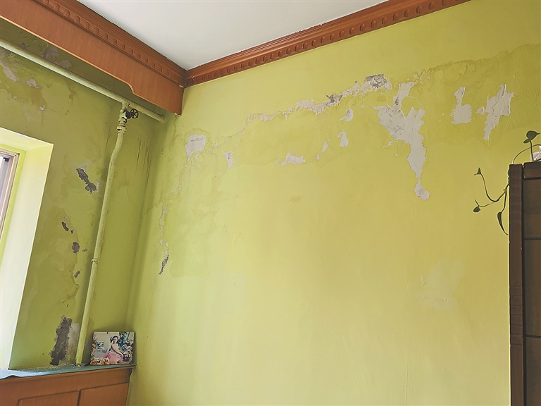 8日,生活报记者再次来到该楼部分居民家。1单元701室的李女士看着自家渗雨的墙面开裂、脱皮又发霉,很是头疼。李女士家两个卧室的墙面均有雨水渗漏的痕迹,记者摸了一下墙面,感觉有点湿。李女士拉开窗帘展示漏水点时,窗台上有一大片墙皮掉了下来,“你看现在这个墙皮有多脆吧,一碰都直掉渣。”李女士无奈地说。