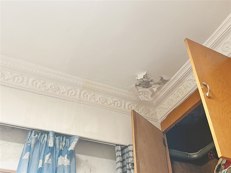 随后,生活报记者来到7单元701室于先生家。“自从拆掉斜坡的房盖后,我家不光房顶漏水,侧墙渗水也很严重。”于先生向记者介绍。记者看到于先生家两个卧室的墙面被雨水浸湿发黄,房顶还有一条半米长的开裂痕迹。“以前房盖宽于楼体,每当下雨,雨水沿着房盖就流下去了,根本碰不到我家外墙,拆完房盖后,部分雨水就会渗进我家墙里了,现在只给我们铺上一层油毡纸,以后肯定还会漏水。要想彻底解决漏水问题,我们居民希望恢复坡度房盖。”于先生说出了小区大部分业主的心声。