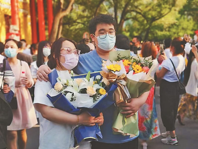 生活报讯 (实习生郭佳鑫 见习记者崔凯歌 记者吕晓艳文/摄) 6月8日16时40分,生活报记者来到哈尔滨市第三中学校南岗校区考点,还有20分钟,高考英语考试即将结束。考点外已经站满了等待考生走出考场的家长、老师,他们手捧着各色花束,举着手机相机,准备记录下考生走出考点的难忘瞬间。17时,铃声响起,考生们陆续走出考场,走向等待他们的老师和家人,他们即将开启崭新的人生旅程。