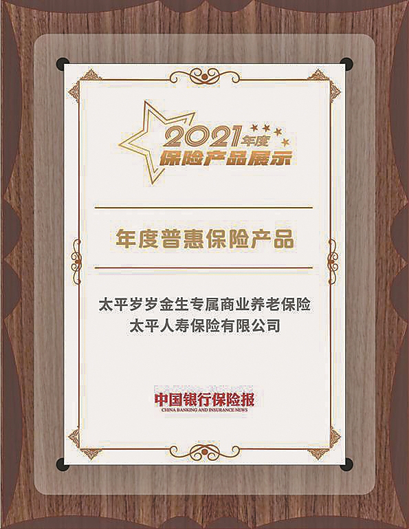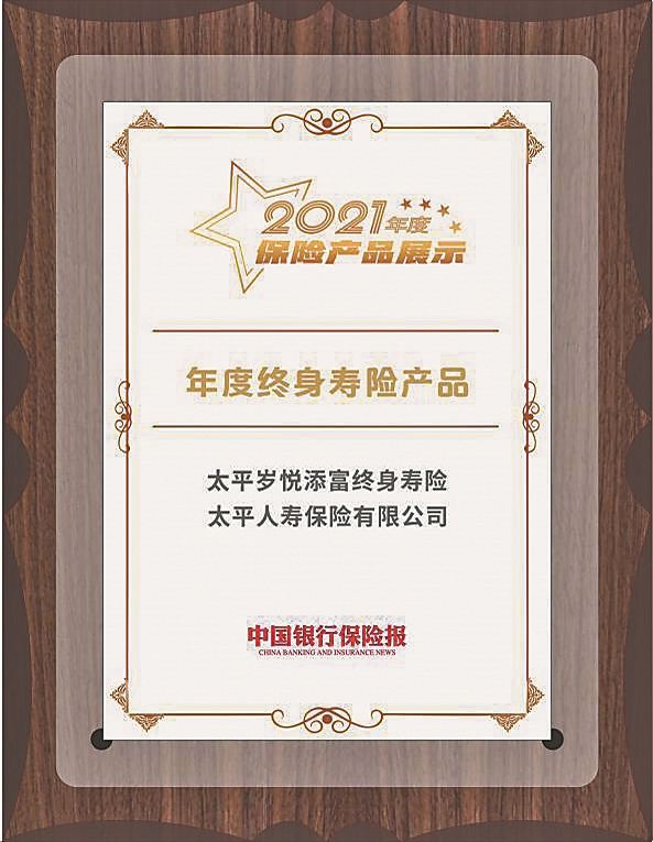 近日,由《中国银行保险报》主办的“2021年度保险产品征集活动”结果揭晓,太平人寿“太平岁悦添富终身寿险”入选年度终身寿险产品,“太平岁岁金生专属商业养老保险”入选年度普惠保险产品。