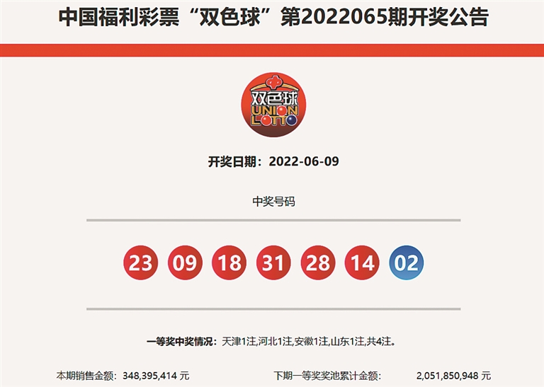6月9日晚,中国福利彩票双色球游戏进行第2022065期开奖。本期双色球红球号码为09、14、18、23、28、31,蓝球号码为02。