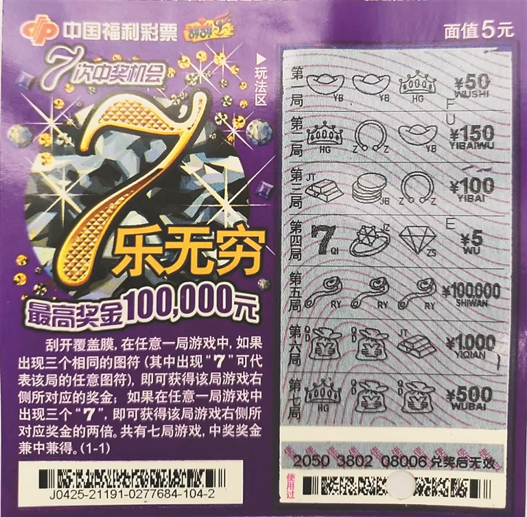 当天,小夏选了4张不同面值、不同种类的刮刮乐,其中,第四张就是“7乐无穷”。她们虽然经常玩刮刮乐,但是却有些“想当然”。她看了看,刮开区没有出现三个“7”,就想当然地以为没有中奖。两个人正准备丢了彩票继续逛,小夏又有些不甘心地拿起彩票一一核对起来。她又仔细读了一遍玩法规则,读着读着,小夏的眼睛越睁越圆。这张彩票第五局游戏中,出现了三个一模一样的“如意”图符,而旁边的金额是“¥100000”。