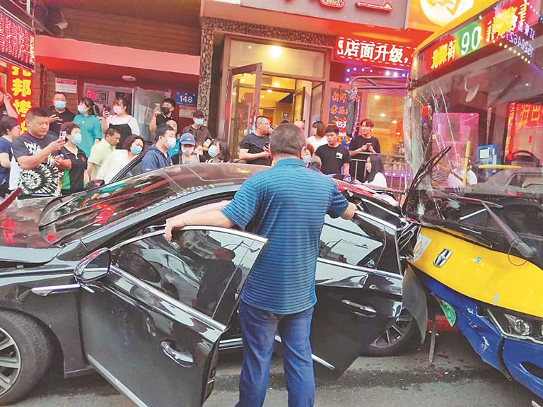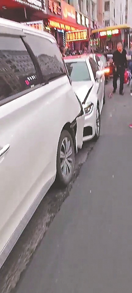 现场一家商店的工作人员向记者介绍,当时一辆90路公交车先与一辆行驶中的轿车发生碰撞,随后公交车又向前行驶,撞上右侧路旁停放的轿车,由于惯性,轿车又连撞前方5辆私家车,共造成8辆车不同程度受损。