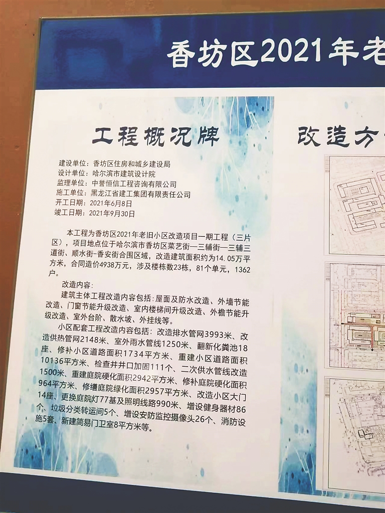生活报帮办记者了解到,三辅花园小区于去年6月被列入香坊区2021年老旧小区改造项目一期,记者在“旧改”指挥部设立的公示板上看到,该工程开工时间为2021年6月8日,建设单位为香坊区住房和城乡建设局,设计单位为哈尔滨市建筑设计院,施工单位为黑龙江省建工集团有限责任公司,改造内容包括:“屋面及防水改造,外墙节能改造,门窗节能改造等”。