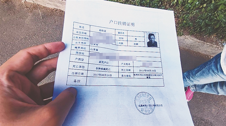 生活报讯 (记者王萌文/摄) 近日,牡丹江的赵女士向本报反映,其父亲2011年去世后“注销”了户口,火化之后也领取了丧葬费。但6年后的一天,她突然接到省公安厅的电话,称全省开展户籍清查行动,检索排查到她父亲的户口没有注销,赵女士又去派出所注销了一次户口。“这几年因为注销户口的问题,错失了一次动迁改善居住条件的机会,继承房产的问题也耽搁了几年。”赵女士很困惑,到底是什么原因造成当年注销户口没成功。16日,生活报记者赶赴牡丹江对此事进行了采访。