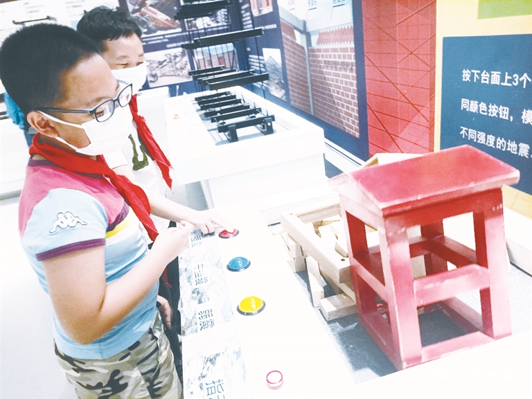 接着我们来到震害防御体验区。讲解后,我亲自体验了由积木搭建的房屋模型在横波纵波下的抗震表现。我还看到了张衡发明的地震仪,不得不说古人真是聪明啊!