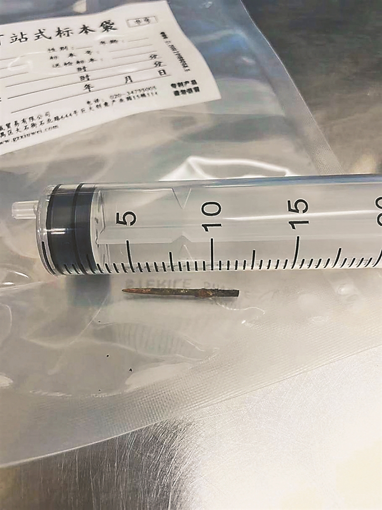 “取出来的铁钉是一枚马蹄钉,已经锈迹斑斑,据我推测,铁钉至少已经在肺里‘隐藏’1年多,因为铁钉的周围已经被包裹住。”徐进志说,他们也询问过刘女士,而刘女士对这根铁钉什么时候,怎么进入体内的一无所知。后来据他们推测,铁钉很可能来自于农用锄具,可能是刘女士在务农时,铁钉不小心进入体内。