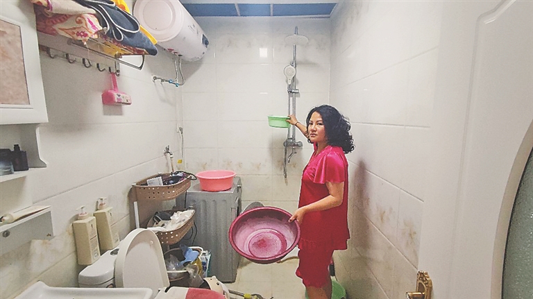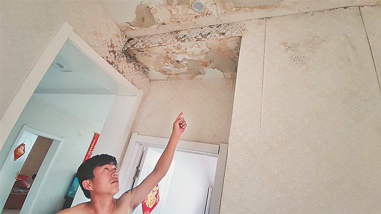 21日,生活报记者来到阿城体东名城小区,与业委会负责人及物业公司负责人一起来到七号楼5单元顶楼的赵女士家。记者在室内看到,床上堆满了衣服等物品。据赵女士介绍,墙角漏雨把衣柜里的衣服、棉被都淹了,因此才把东西堆到了床上。“一到夏天下雨我们就遭罪,这才搬进来几年,房子漏得不像样子。”记者看到,赵女士家的棚顶和墙面明显有被水泡过的痕迹,卧室的棚顶发霉长毛。在卫生间里,临时用来接雨水的盆还没有撤掉,因为棚顶有存水的地方,所以一到雨天就会变成“外面大雨屋里小雨”。“雨大的时候,这几个盆都接不过来,说不定从哪儿就漏水,而且最怕半夜下雨,全家人都得爬起来接水,这一宿就不用睡觉了。”
