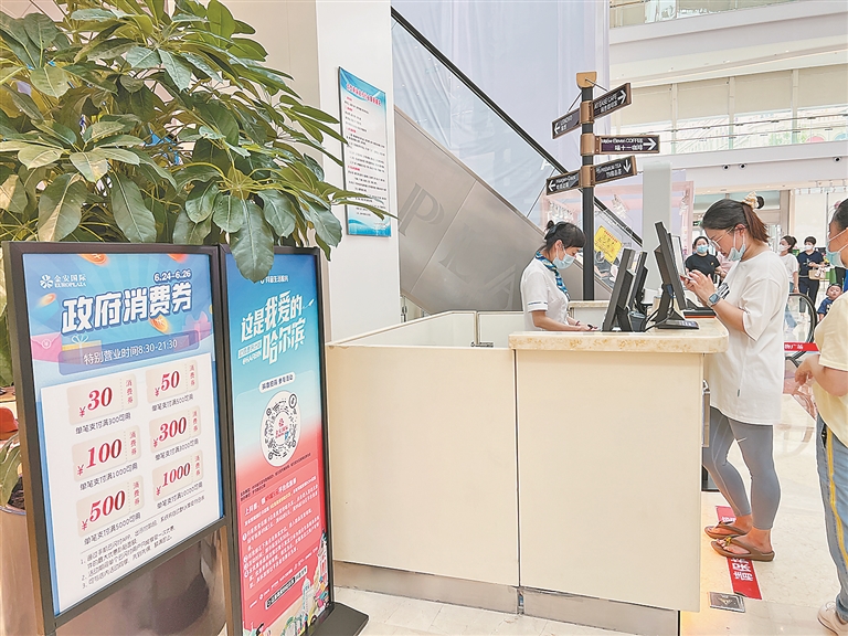 生活报讯 (实习生张瑞焓 记者梁晨文/摄) 24日起,哈尔滨市开展以“助企惠民 促进消费”为主题的政府促消费活动,政府消费券发放首日,商场的热闹劲儿又回来啦!该活动自6月24日至26日,市政府向限上大型百货商场(不含超市)、家电通讯等行业投入2670万元补贴资金,每日9时准时发放,每日发放补贴资金890万元。