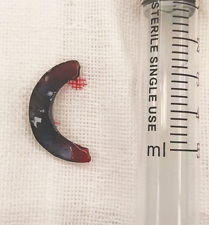 经过进一步检查,医生在小王的食道入口处看到了一个半圆形异物,大概有4厘米。在手术中,田霖丽主任、李茗华主任医生、赵蕊副主任医师切开颈部探查,逐层打开皮肤、肌肉、分离血管后,终于发现一个穿透了食道壁的硬质异物。