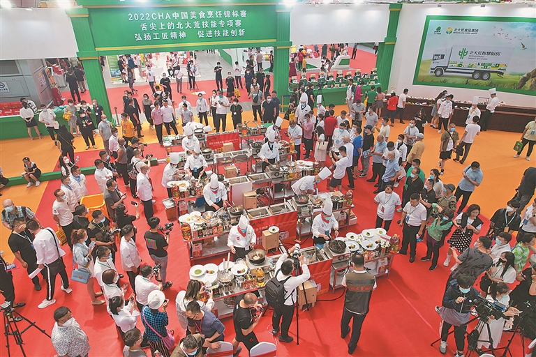 开幕现场除了食材展销外,还特别设置了厨艺技能比拼,在北大荒展区内,进行CHA中国美食烹饪锦标赛暨“舌尖上的北大荒”技能专项赛,通过厨艺大比拼,展示东北食材的舌尖美味。大赛通过举办中式烹饪、中式面点、餐厅服务等多种技能竞赛和宴席展示活动,推出北大荒优质食材和经典菜肴,展现北大荒厨师的高超技艺。