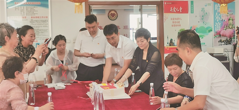 生活报6月30日讯 (记者黄迎峰文/摄) 6月30日,黑龙江省慈善总会、生活报社、黑龙江省仁芯基金会一同走进哈市香坊区香电社区、新地社区,为20余名老党员送去两个大蛋糕和一百箱弱碱水,和他们一同祝福党的生日,祝福祖国繁荣昌盛。