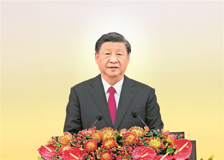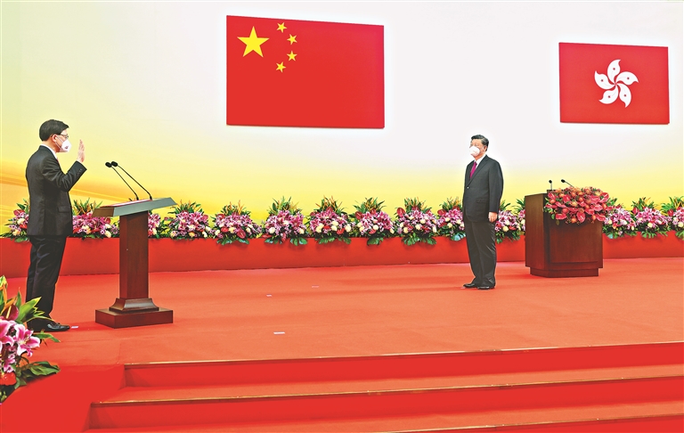 7月1日上午,庆祝香港回归祖国25周年大会暨香港特别行政区第六届政府就职典礼在香港会展中心隆重举行。中共中央总书记、国家主席、中央军委主席习近平出席并发表重要讲话。 新华社记者 姚大伟 摄