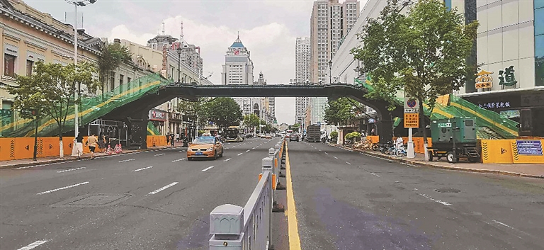 1日,生活报记者在现场看到,这座人行过街天桥两侧通道已经围挡起来。桥上护栏部分已经全部拆除,只剩下桥体,几名工人正在桥面上施工。