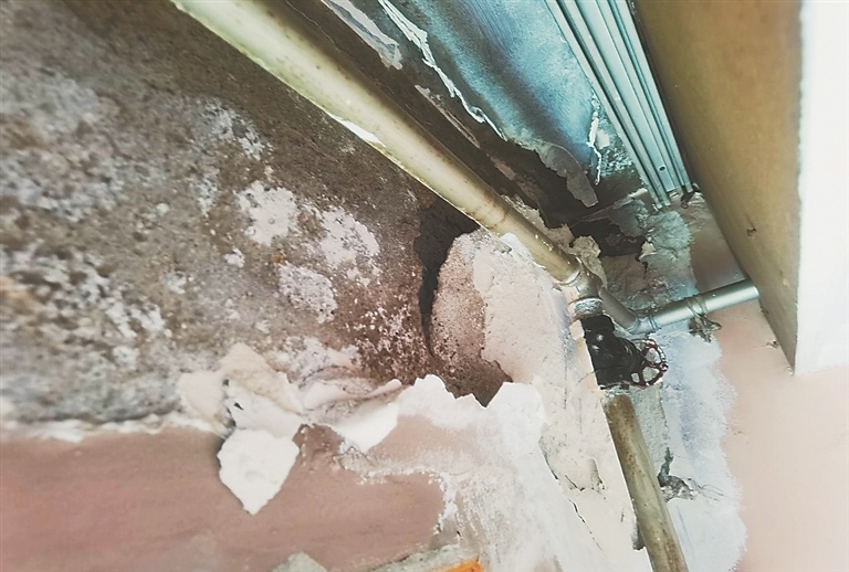8日下午,记者在赵女士家看到,主卧窗户附近的一块墙皮开裂翘起,窗户框附近的墙皮已经脱落,棚顶多有漏雨被泡过的痕迹。据赵女士介绍,每天都得清理棚顶掉在被褥上的渣,前天就开始渗水,但还没这么严重,去年多次找到物业,当时物业承诺给修,但至今也没有消息。