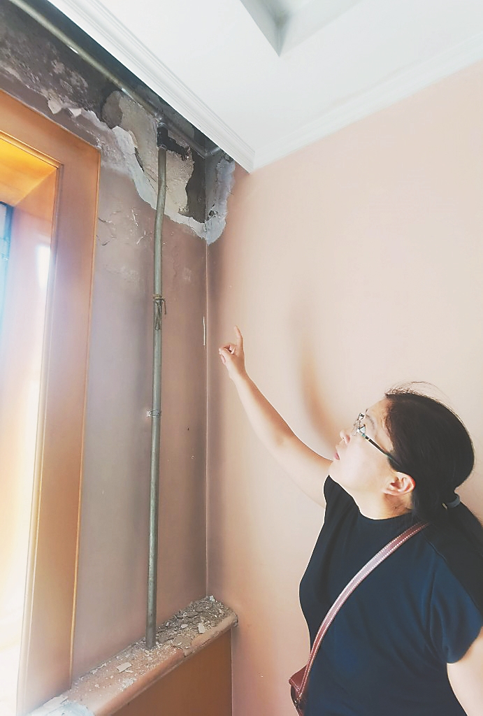 生活报讯 (记者肖劲彪文/摄) 8日,家住哈尔滨市南岗区马端街15号先锋二区205栋七楼的赵女士反映,外面下大雨屋内下小雨,墙皮都已开始脱落。去年找到物业说开始维修,一直也没有动作,一拖再拖严重影响了居民的生活。