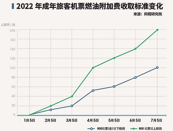 2022年1月5日,国内航线曾取消燃油附加费的征收。但伴随着油价不断走高,2月5日起又恢复征收燃油附加费,此后燃油附加费进入每月上涨一次的节奏,直到7月涨到了100、200元的高位。