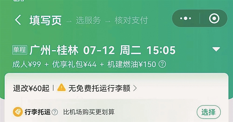 比如,7月12日广州到桂林,成人票价99元,机建燃油费则有150元。