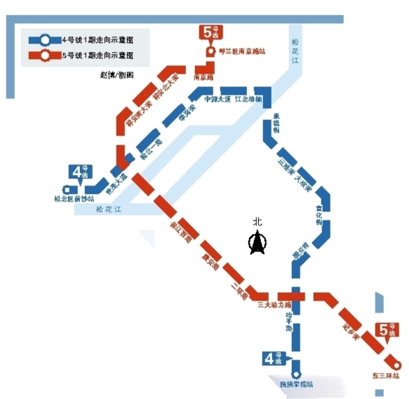 4号线一期工程:起自松北区前沙站,主要沿世茂大道、松北一路、学海街、中源大道、江北绿轴、承德街、三姓街、大成街、宣化街、和平路、哈平路敷设,终点至民族学院站,全长34.5公里,设29座车站,1座哈平路停车场、1座前沙车辆段。