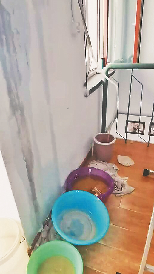 生活报讯 (记者李威兵文/摄) 11日,生活报报道了哈市道外区兴业街153号的王先生家二楼棚顶于3日晚上突然漏水一事。12日,王先生再次向记者反映,现在屋里漏水变严重了。