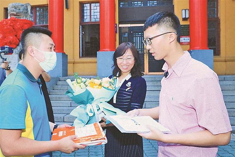 生活报12日讯(记者吕晓艳 部分综合黑龙江日报) “这是2022年邮递的第一封高考录取通知书,可以派送,路上注意安全。”7月12日8时45分,揽投员李鑫接到邮递通知书和一束祝贺的花束的任务。9时,李鑫将哈尔滨工业大学的录取通知书和鲜花顺利送到在哈尔滨市第三中学南岗校区等候的考生高昊晨手中。至此,2022年高考录取通知书寄递服务正式拉开帷幕。