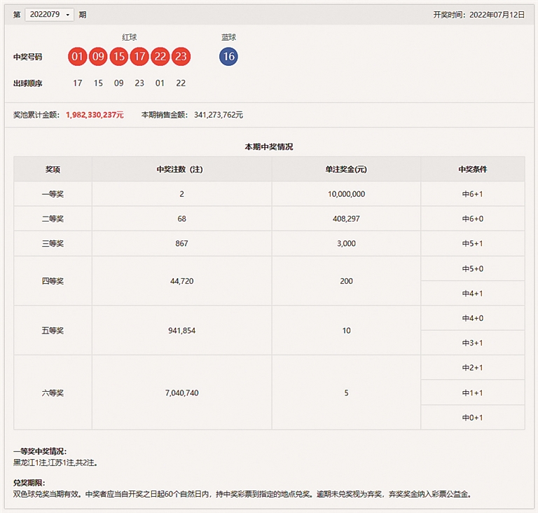 12日晚,中国福利彩票双色球游戏进行第2022079期开奖。当期双色球红球号码为“01 09 15 17 22 23”,蓝球号码为“16”。