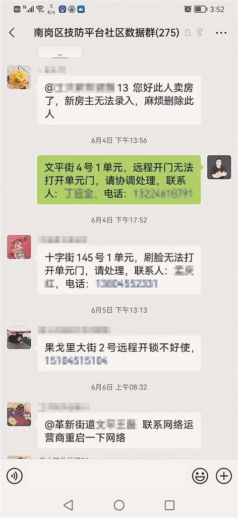 12日下午,记者联系到文平社区片区干事王磊,他表示,今年2月起就有部分居民向社区反映单元门远程开锁不好使。“安装完门锁后,我们被拉进了名为‘南岗区技防平台社区数据群’的微信群,每次有居民投诉,我们都第一时间向群里汇报并留下联系方式,可一直都没有人进行处理。”王磊向记者展示了他在群里发送的报修信息,第一次上报时间为2月25日,第二次为3月3日,第三次为3月11日,第四次为6月4日。记者还发现,群内还有其他社区也在反映类似远程开锁不好使的问题。