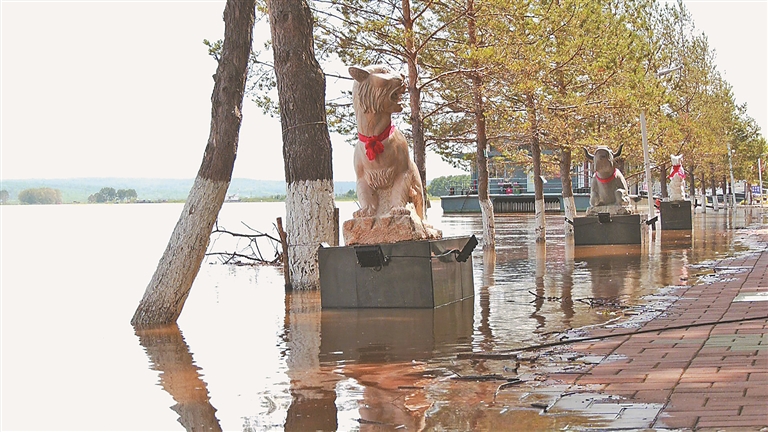 14日,在呼玛县江畔公园,原来距离黑龙江江面还有几米高的人行步道路面,受汛情影响已经过水。为确保行人和游客安全,呼玛县相关部门及时拉起了警戒线、安放了警示标志,在闸门口处准备了防汛沙袋,加强了巡护,并将根据水情变化不断调整措施。