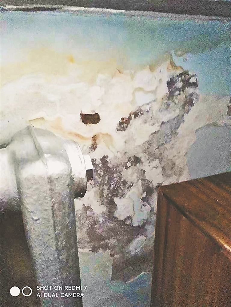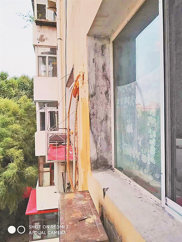 生活报讯 (实习生张佩瑜 张瑞焓 帮办记者梁晨文/摄) 近日,哈尔滨市南岗区沙曼小区三街区12号楼3单元502室居民姚先生向记者反映,2017年物业做外墙保温时,施工方误将自家的空调排水管埋进了水泥墙里,造成屋内墙壁长毛发臭。姚先生多次找物业投诉,问题一直未得到解决。