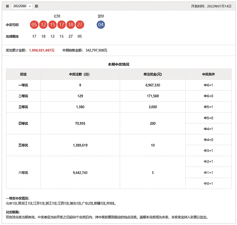 7月14日晚,中国福利彩票双色球游戏进行第2022080期开奖。当期双色球红球号码为05、12、15、17、18、27,蓝球号码为04。