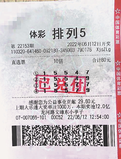 生活报讯 (许褚) 6月12日,体彩“排列5”第22153期开出号码“1、5、5、4、7”,当期一等奖开出93注,单注奖金为10万元。来自江苏省连云港市的购彩者杨先生幸运地斩获当期“排列5”一等奖10注,收获奖金100万元。