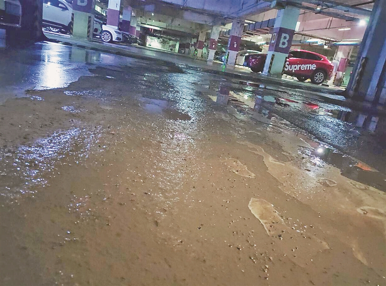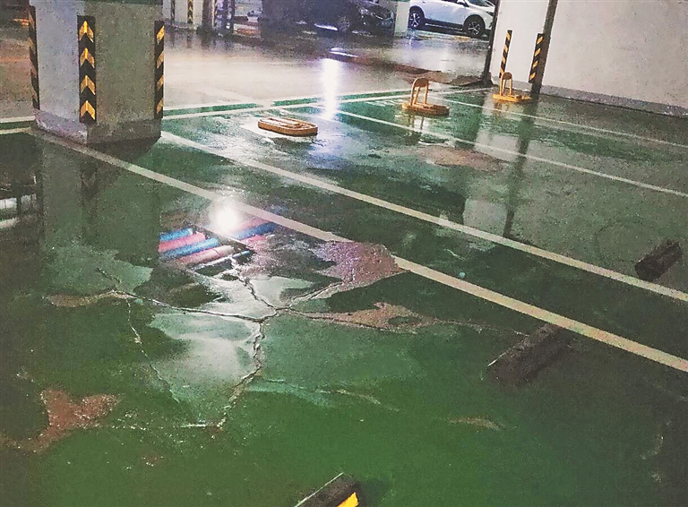 生活报讯 (记者李威兵文/摄) 22日,哈尔滨市民通过本报热线反映,哈市南岗区锦绣华城小区地下车库常年漏水,地面积水,很多车都停在“水坑”里,电动车车主担心地下车库潮湿有安全隐患,多次向物业反映,但始终无法彻底解决问题。当日,记者来到负责该小区的弘润物业,工作人员说:“这是开发遗留的问题,找开发去说吧。”