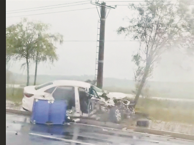 记者从现场人员提供的一段视频看到,一辆白色轿车停在人行道上,车辆前部车体严重变形,当时人员已被送往医院救治。